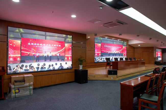 經(jīng)過(guò)改造,安全教育館新增3塊LED屏幕,其中主席臺(tái)處主LED顯示屏面積約20平方,東西兩側(cè)輔助LED顯示屏各約6平方。LED屏幕采用顯示單元像素間距為P2-2.5,具有顯示面積大、分辨率高、超高對(duì)比度、超寬視角、無(wú)縫拼接、維護(hù)方便等優(yōu)點(diǎn)。改造后進(jìn)一步提升了視頻會(huì)議效果,增加了會(huì)場(chǎng)多功能性。
