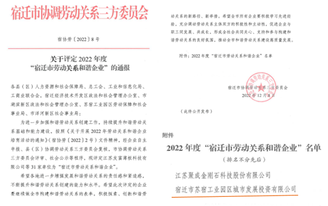 近日,園區(qū)城發(fā)公司獲評2022年度“宿遷市勞動關(guān)系和諧企業(yè)” 榮譽(yù)稱號。